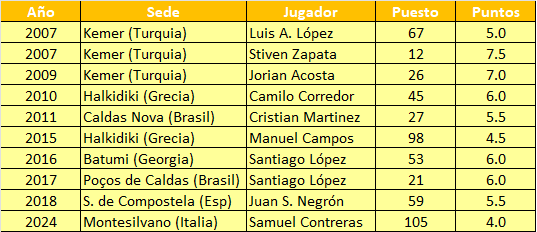 A continuación se mostrará una tabla resumen con la participación colombiana en esas fases de Copa Mundo, en donde los jugadores llegan clasificados luego de jugar sus respectivos torneos dentro del continente americano. Sólo 11 colombianos han jugado estas fases de Copa Mundo, habiendo repetido participación sólo 2 de ellos, Alonso Zapata y Miguel Cuellar. Se resalta que sólo Gildardo García ha sido el único colombiano que ha logrado avanzar a la siguiente fase de "Knockout", en el año de 1997, lo hizo luego de vencer en su match a Emil Sutovsky 1.5 a 0.5 en las Vegas.